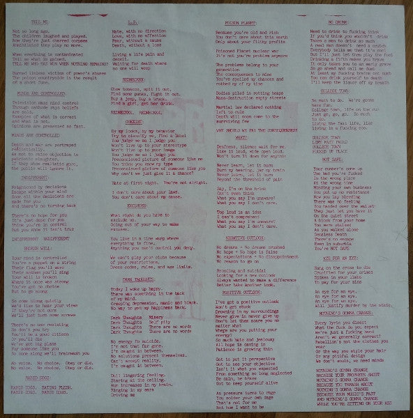 Issued with 28 x 28.7 cm insert printed in red or red & / black (lyrics / acknowledgements, merchandise, label offerings).