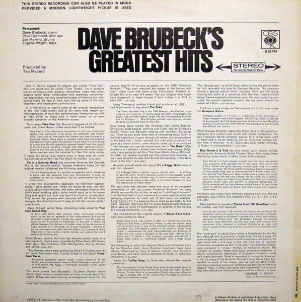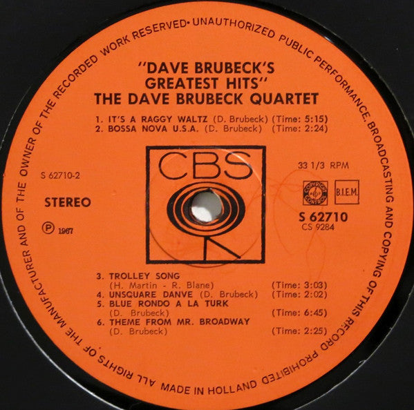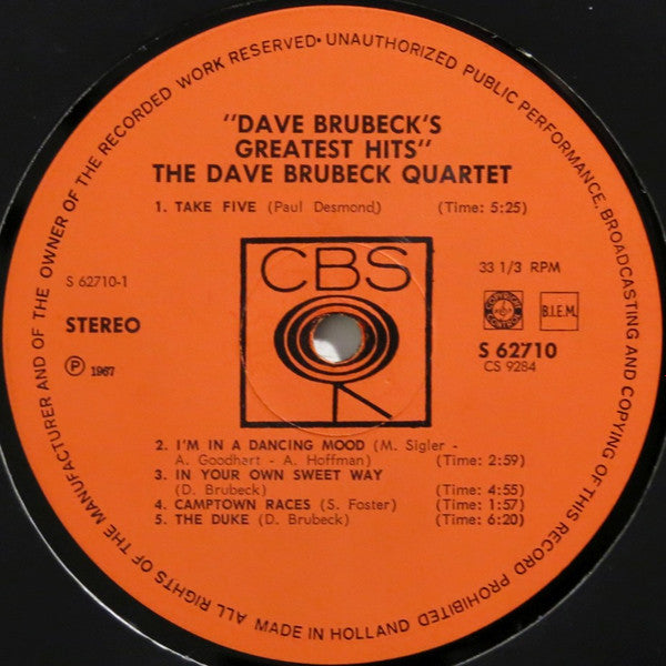 A1. Take Five 5:25 A2. I'm In A Dancing Mood 2:59 A3. In Your Own Sweet Way 4:55 A4. Camptown Races 1:57 A5. The Duke 6:20 B1. It's A Raggy Waltz 5:15 B2. Bossa Nova U.S.A. 2:24 B3. Trolley Song 3:03 B4. Unsquare Dance 2:02 B5. Blue Rondo A La Turk 6:45 B6. Theme From Mr. Broadway 2:25
