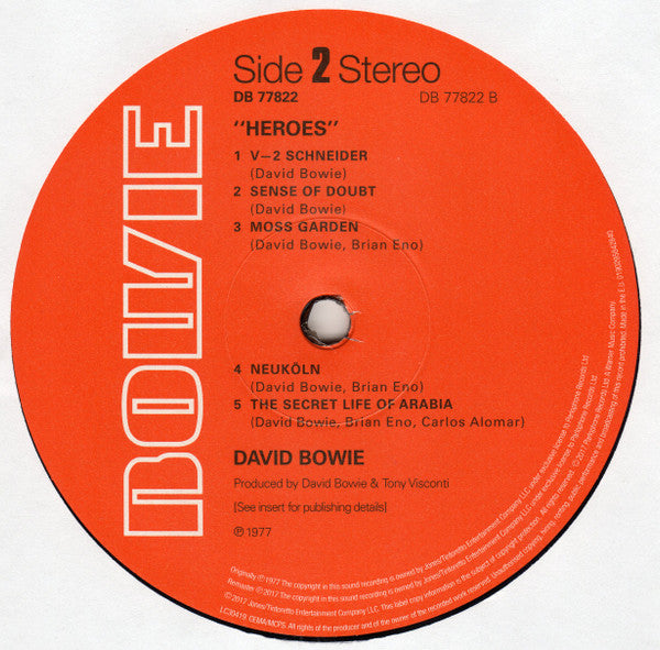 Includes insert with lyrics and publishing details, a facsimile of the original fan club leaflet, and a facsimile of the original UK white inner sleeve with rounded corners. This version is also the one sent out to the buyers of the "New Career In A New Town" boxed set as a replacement for the "defective" record. It was not supplied with an outer sleeve, just a poly lined inner sleeve. Catalog number as 0190295842840 (DB 77822) on spine. Catalog number as DB 77822 on front sleeve, rear sleeve, insert and labels. 2017 is printed on centre labels and sleeve, but the LP wasn't released until February 2018. Runouts are etched. In runouts, all Optimal plating symbols may be inverted (“⊥” vs “T”) and/or mirrored (“1△” vs “△↾”). Specifically: variant 1, side B: "4" is mirrored; variant 2, sides A and B: "5" in "15" is mirrored; variant 3, side A: 5 in "V5" is mirrored, side B: 5 in "1=5" is mirrored; variant 4, sides A and B: "2" in the Optimal symbols is inverted, e.g. "ᘔ"; variant 5, side A: "'91" is mirrored, side B: "T=S" is mirrored. [Sticker on front cover: Remastered heavyweight 180g vinyl [Rear sleeve: Recorded at Hansa by the Wall, Berlin Engineers: Tony Visconti, Colin Thurston, and Mountain Studios, Montreux Mixed at Mountain Studios, Montreux Originally ℗1977 The copyright in this sound recording is owned by Jones/Tintoretto Entertainment Company LLC under exclusive license to Parlophone Records Ltd. Remaster ℗2017 The copyright in this sound recording is owned by Jones/Tintoretto Entertainment Company LLC under exclusive license to Parlophone Records Ltd. ©2017 Jones/Tintoretto Entertainment Company LLC. [... ©2017 Parlophone Records Ltd. A Warner Music Group Company. [Insert: All songs published by North America - Tintoretto Music (BMI) administered by RZO Music, Inc., Screen Gems-EMI Music, Inc. (BMI) o/b/o EMI Music Publishing Ltd. Rest of World - Tintoretto Music/RZO Music Ltd., EMI Music Publishing Ltd. except '"Heroes"', 'Moss Garden' and 'Neuköln' published by North America - Tintoretto Music (BMI) administered by RZO Music, Inc., Screen Gems-EMI Music, Inc. (BMI) o/b/o EMI Publishing Ltd., Universal Music Careers (BMI) Rest of World - Tintoretto Music/RZO Music Ltd., EMI Music Publishing Ltd., Universal Music MGB Ltd. and 'The Secret Life Of Arabia' published by North America - Tintoretto Music (BMI) administered by RZO Music, Inc., Unitunes Music (ASCAP), a division of Unidisc Music Inc., Screen Gems-EMI Music, Inc. (BMI) o/b/o EMI Publishing Ltd., Universal Music Careers (BMI). Rest of World - Tintoretto Music/RZO Music Ltd., EMI Music Publishing Ltd., Universal Music MGB Ltd., Unitunes Music (ASCAP), a division of Unidisc Music Inc. [Fan club leaflet: This is a replica of the original issued in 1977 and is no longer valid. [Labels: ℗ 1977 Originally ℗ 1977 The copyright in this sound recording is owned by Jones/Tintoretto Entertainment Co., LLC under exclusive license to Parlophone Records Ltd. Remaster ℗ 2017 The copyright in this sound recording is owned by Jones/Tintoretto Entertainment Co., LLC under exclusive license to Parlophone Records Ltd. © 2017 Jones/Tintoretto Entertainment Co., LLC. [... © 2017 Parlophone Records Ltd. A Warner Music Company. [... Made in the EU.