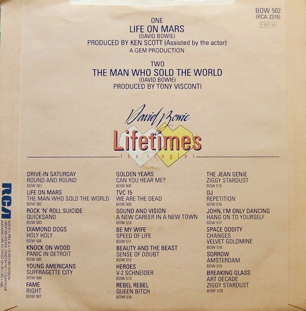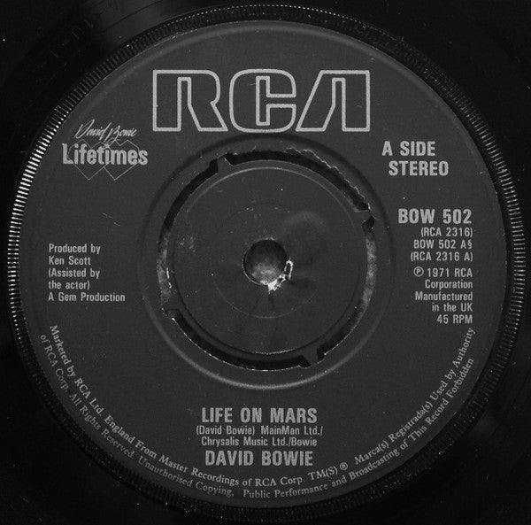 Track A is written "Life on Mars" on cover and label - without the question mark. Reissue of RCA 2316 (originally released in 1973) per brackets on the A and B side labels, see 49817.