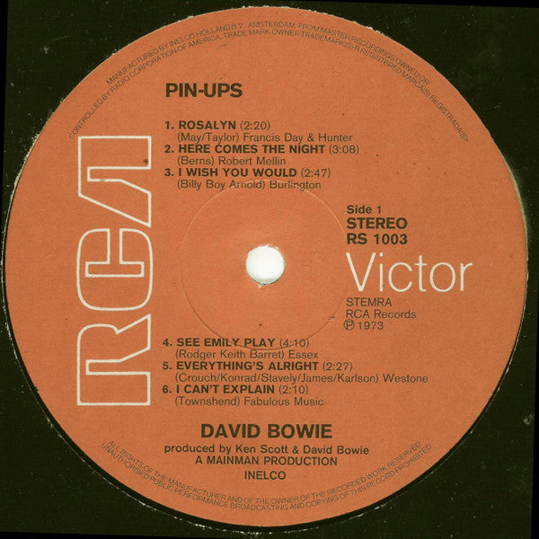Title on front cover and spine: 'Pinups' Title on labels: 'Pin-Ups' A1 & B3: Originally performed by The Pretty Things A2: Originally performed by Them A3 & B4: Originally performed by The Yardbirds A4: Originally performed by Pink Floyd A5: Originally performed by The Mojos A6 & B5: Originally performed by The Who B1: Originally performed by The Easybeats B2: Originally performed by The Merseys B6: Originally performed by The Kinks Manufactured by Inelco Holland B.V., Amsterdam. Comes with an 12" picture/info insert.