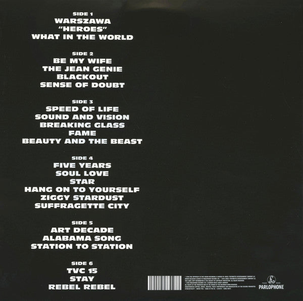 Record Store Day 2018 Exclusive (latter word embossed), as per the silver hype sticker that appears on the bottom right hand corner of the shrink wrap. Trifold sleeve, black inner sleeves with plastic lining. Recorded live by Tony Visconti with The Manor Mobile. Recording engineered by Jeremy Allom and Ken Capper Mixed by David Bowie and David Richards at Mountain Studios, Montreux, 17th - 22nd January, 1979 'Sound and Vision' and 'TVC 15' mixed by John Prestage at Air Studios, London. Recorded live at Earls Court, London, 30th June and 1st July, 1978. Mastered by Ray Staff at Air Mastering, London with thanks to Cicely Balston and John Webber. Runouts are etched. In runouts, all Optimal plating symbols may be inverted (e.g., “⊥” vs “T”) and/or mirrored (e.g., “1△” vs “△↾”).