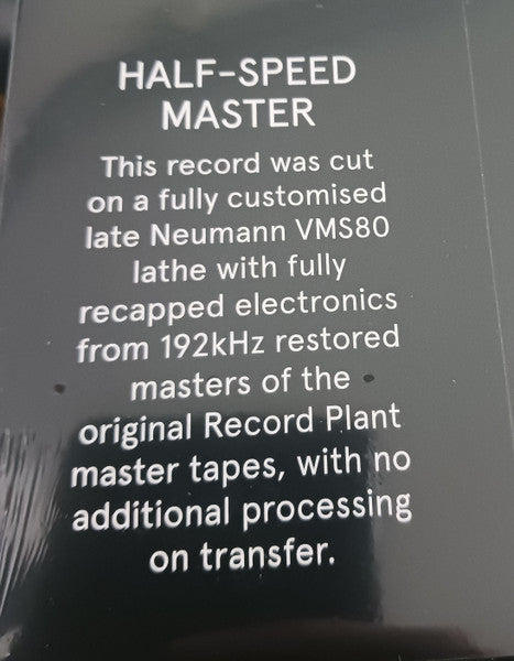 "This record was cut on a fully customised late Neumann VMS80 lathe with fully recapped electronics from 192kHz restored masters of the original Record Plant master tapes, with no additional processing on transfer."