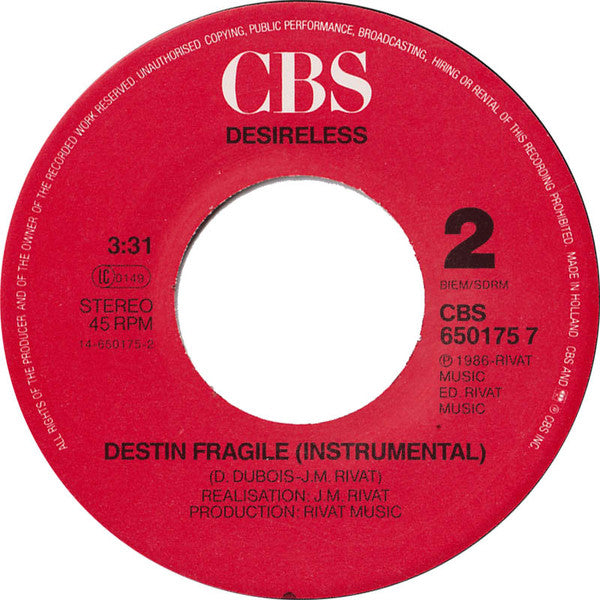 Ed. Rivat Music Synthetiseurs, Programmation: Producteur Prise de Son (Sound Recording): Studio d'Aguesseau Mixage (Mixing): Studio Marcadet Dédié à Gopala (Dedicated to Gopala) [Labels Production: Rivat Music [Back sleeve Production - Éditions Rivat Music Made in Holland ℗ 1986 Rivat Music/© 1986 Rivat Music/CBS Distribué en France par CBS Disques ® CBS Inc. Some copies in Germany came with additional sticker on cover front: "Der Super-Smash-Hit aus Frankreich"
