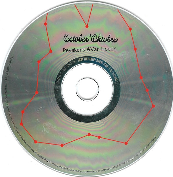 "October'Oktobre is a biyearly Brussels theater project by Dito'Dito. During the month of October one can attend a variety of theater plays alternately in the Beursschouwburg and in the Théâtre de la Balsamine. During the edition of 2001 each evening was concluded with a song. Dett Peyskens and Danny Van Hoeck asked 12 authors to write lyrics. Based on those, both musicians composed together with a guest musician (each week a different one) the song of the day (each day a different one). On the final evening there was a surprise concert where all the musicians performed the complete repertoire. Théâtre de la Balsamine, Beursschouwburg and Dito'Dito decided to They decided to immortalize this repertoire on CD."