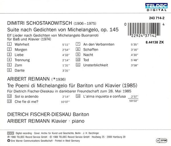 Dmitri Shostakovich, Aribert Reimann, Dietrich Fischer-Dieskau - Suite Nach Gedichten Von Michelangelo / Tre Poemi Di Michelangelo (CD, Album)