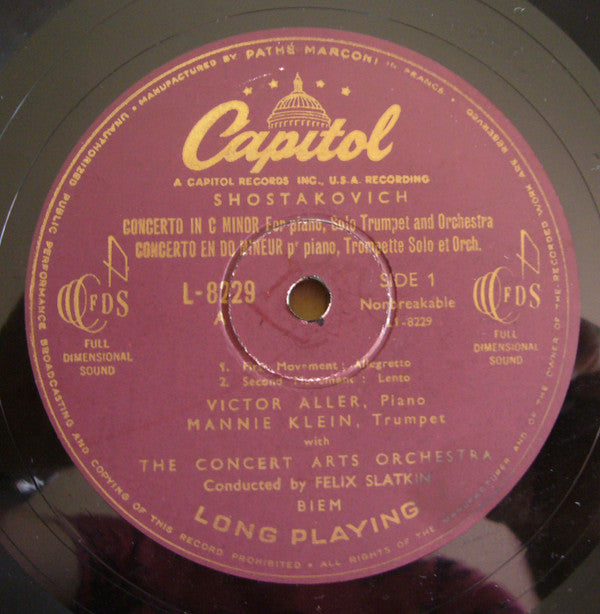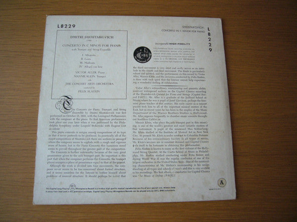 Dmitri Shostakovich, Victor Aller, Manny Klein With The Concert Arts Orchestra Conducted By Felix Slatkin - Concerto In C Minor For Piano With Trumpet And String Orchestra (10", Mono)