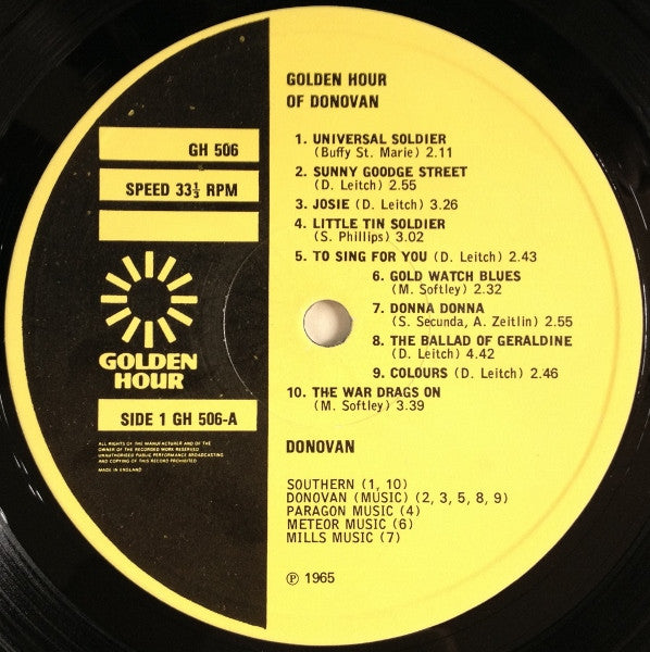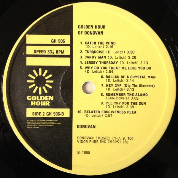 Yellow/ black "Golden Hour" labels (no stereo credited on labels) Semi-sheen front embossed / textured sleeve. Recorded 1965. Labels: Made in England Publishing info: A1, A10: Southern A2, A3, A5, A8, A9, B1 to B7, B9, B10: Donovan (Music) A4: Paragon Music A6: Meteor Music A7: Mills Music B8: Vidor Pubs Inc (MCPS) ℗ 1965 Sleeve: Pye Records (Sales) Ltd. A.T.V. House, Great Cumberland place, London W.1. Electronically re-channelled for Stereo. Printed and made by Garrod and Lofthouse Ltd. Track B8: credited as - "The Alamo" on sleeve - "Remember The Alamo", on label. Note: Similar version to: Golden Hour Of Donovan which has a label variation. Track A7: Only one 'S. Secunda' is credited on release, in fact this name comprises two people. The correct credit is "Sholom Secunda" for music and "Sheldon Secunda" (Son of Sholom) for lyrics.