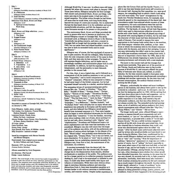 occasion. The omissions were necessarily arbitrarily decided on, and there was no simple system used. My tendency was to do without vocal and pop-song numbers and some very-frequently recorded Ellington standards, and to retain pieces rarely or never to be heard elsewhere - even if the performance was less than perfect. - Orrin Keepnews)