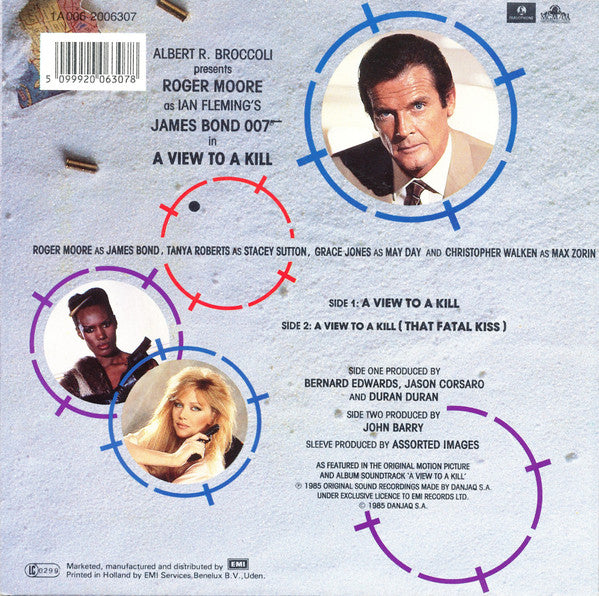 Rear sleeve: As featured in the original motion picture and album soundtrack "A View To A Kill". ℗ 1985 Original Sound Recordings made by Danjaq S.A. under exclusive licence to EMI Records Ltd. © 1985 Danjaq S.A Printed in Holland by EMI Services Benelux B.V., Uden. Labels: Made in E.E.C. Track A: Recorded at Maison Rouge and CTS Studios, London. Mixed at The Power Station Studios, New York. Track B: Recorded at CTS Studios, London. Runout info: Runout variants 7 & 8 are stamped (variants 1-6 are undefined but are most likely also stamped). Otherwise identical to [r=18969007 but with a jagged ring on the runout groove. Identical to [r=9986010 as for the labels but different sleeve (e.g. with barcode and different first cat.#).