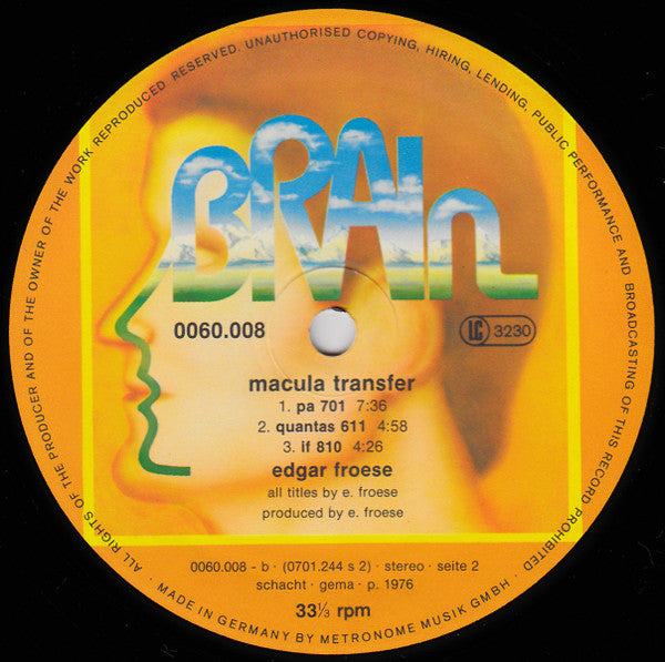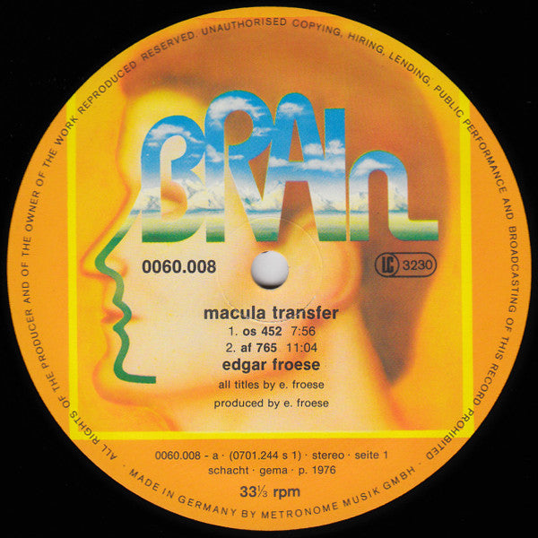 Also released with the same label design but made by Metronome Records GmbH and printed "brain 60.008" catalogue # on labels.