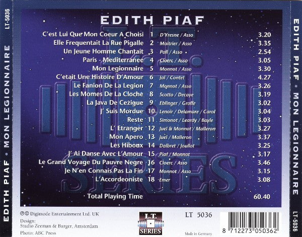 1. C'Est Lui Que Mon Coeur A Choisi 3:202. Elle Fréquentait La Rue Pigalle 3:353. Un Jeune Homme Chantait 2:544. Paris - Méditerranée 3:055. Mon Légionnaire 3:306. C'Est Une Histoire D' Amour 4:277. Le Fanion De La Légion 3:268. Les Momes De La Cloche 3:199. La Java De Cezigue 3:0210. J'Suis Mordue 3:0411. Reste 3:0312. L'Etranger 3:2713. Mon Apero 3:2714. Les Hiboux 3:2515. J'Ai Dansé Avec L'Amour 3:1716. Le Grand Voyage Du Pauvre Negre 3:4617. Je N'En Connais Pas La Fin 3:1518. L'Accordéoniste 3:08
