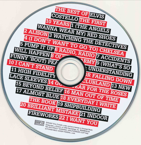 1. Elvis Costello - (The Angels Wanna Wear My) Red Shoes 2:512. Elvis Costello - Alison 3:263. Elvis Costello - Watching The Detectives 3:484. Elvis Costello & The Attractions - (I Don't Want To Go To) Chelsea 3:135. Elvis Costello & The Attractions - Pump It Up 3:206. Elvis Costello & The Attractions - Radio, Radio 3:087. Elvis Costello & The Attractions - Accidents Will Happen 3:038. Elvis Costello & The Attractions - Oliver's Army 3:019. Elvis Costello & The Attractions - (What's So Funny 'Bout) Peace, Love & Understanding 3:3210. Elvis Costello & The Attractions - I Can't Stand Up For Falling Down 2:0911. Elvis Costello & The Attractions - High Fidelity 2:2712. Elvis Costello & The Attractions - Clubland 3:3613. Elvis Costello & The Attractions - New Lace Sleeves 3:4414. Elvis Costello & The Attractions - Good Year For The Roses 3:1115. Elvis Costello & The Attractions - Beyond Belief 2:3416. Elvis Costello & The Attractions - Man Out Of Time 5:2517. Elvis Costello & The Attractions - Almost Blue 2:4318. Elvis Costello & The Attractions - Everyday I Write The Book 3:5619. Elvis Costello & The Attractions - Shipbuilding 4:5420. The Costello Show, The Confederates - Brilliant Mistake 3:4521. The Costello Show, The Confederates - Indoor Fireworks 4:0522. Elvis Costello & The Attractions - I Want You 6:43