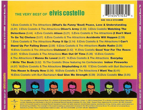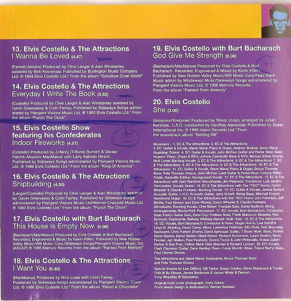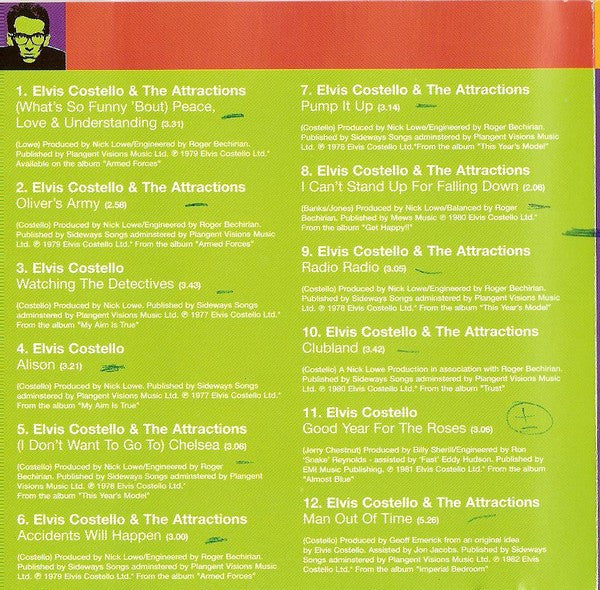 1. Elvis Costello & The Attractions - (What's So Funny 'Bout) Peace, Love & Understanding 3:312. Elvis Costello & The Attractions - Oliver's Army 2:583. Elvis Costello - Watching The Detectives 3:444. Elvis Costello - Alison 3:215. Elvis Costello & The Attractions - (I Don't Want To Go To) Chelsea 3:076. Elvis Costello & The Attractions - Accidents Will Happen 2:597. Elvis Costello & The Attractions - Pump It Up 3:148. Elvis Costello & The Attractions - I Can't Stand Up For Falling Down 2:069. Elvis Costello & The Attractions - Radio Radio 3:0510. Elvis Costello & The Attractions - Clubland 3:4211. Elvis Costello - Good Year For The Roses 3:0712. Elvis Costello & The Attractions - Man Out Of Time 5:2613. Elvis Costello & The Attractions - I Wanna Be Loved 4:4714. Elvis Costello & The Attractions - Everyday I Write The Book 3:5215. The Costello Show, The Confederates - Indoor Fireworks 4:0716. Elvis Costello & The Attractions - Shipbuilding 4:4917. Elvis Costello, Burt Bacharach - This House Is Empty Now 5:0618. Elvis Costello & The Attractions - I Want You 6:4119. Elvis Costello, Burt Bacharach - God Give Me Strength 6:0820. Elvis Costello - She 3:05