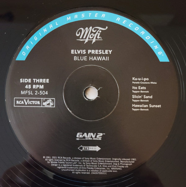 MASTERED FROM THE ORIGINAL MASTER TAPES AND PRESSED AT RTI 1/4" / 15 IPS analog master to DSD 256 to analog console to lathe Mastered by Krieg Wunderlich, Assisted by Rob LoVerde at Mobile Fidelity Sound Lab ® Sebastopol, CA on the GAIN 2 ULTRA ANALOG SYSTEM ™ © 1961, 2021 RCA Records, a division of Sony Music Entertainment. Originally released 1961. All rights reserved by RCA Records, a division of Sony Music Entertainment. Manufactured for Mobile Fidelity Sound Lab®, Inc. by Sony Music Entertainment. Dog & Phonograph Design is a registered trademark Technicolor S.A. Elvis and Elvis Presley are registered trademarks of Elvis Presley Enterprises, Inc. Made in the U.S.A. 19439916621 From inside the gatefold: Mobile Fidelity Sound Lab ® gratefully acknowledges and thanks these individuals and companies for their technical support and expertise: Tim de Paravicini, Pass Labs, Lipinski Sound and Sound Application. Any sonic artifacts present are a product of the original master tape. Attempts to eliminate them would have negatively impacted the integrity of the presentation.