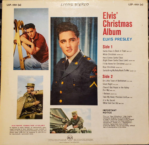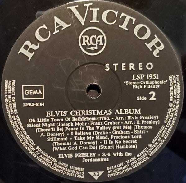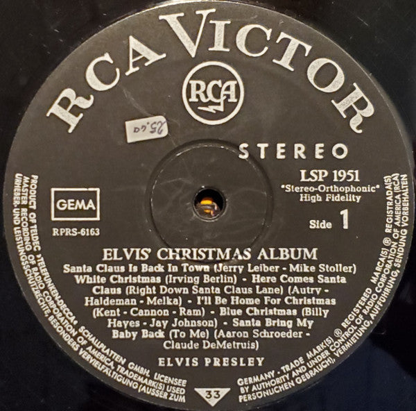 A1. Santa Claus Is Back In Town 2:21 A2. White Christmas 2:23 A3. Here Comes Santa Claus (Right Down Santa Claus Lane) 2:00 A4. I'll Be Home For Christmas 1:54 A5. Blue Christmas 2:05 A6. Santa Bring My Baby Back (To Me) 1:52 B1. Oh Little Town Of Bethlehem 2:34 B2. Silent Night 2:23 B3. (There'll Be) Peace In The Valley (For Me) 3:20 B4. I Believe 2:04 B5. Take My Hand, Precious Lord 3:19 B6. It Is No Secret (What God Can Do) 3:54