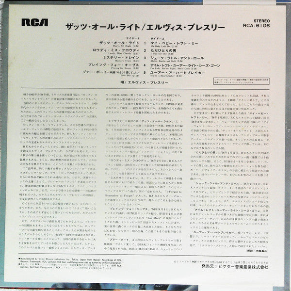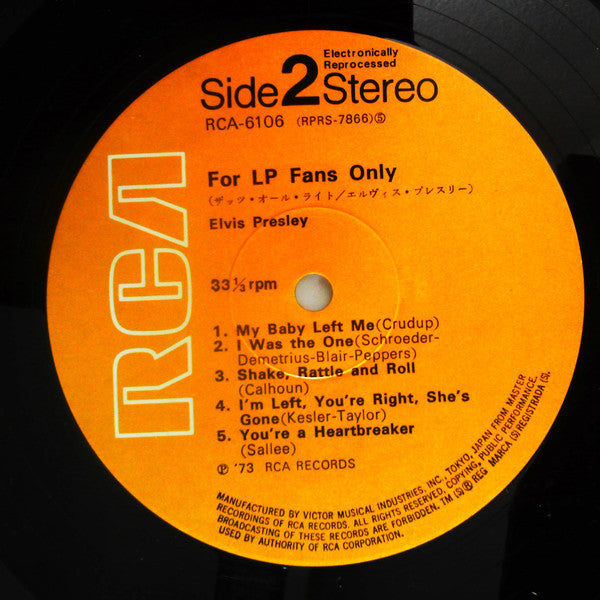 A1. That's All Right 1:56 A2. Lawdy, Miss Clawdy 2:07 A3. Mystery Train 2:25 A4. Playing For Keeps 2:51 A5. Poor Boy 2:13 B1. My Baby Left Me 2:10 B2. I Was The One 2:31 B3. Shake, Rattle And Roll 2:25 B4. I'm Left, You're Right, She's Gone 2:37 B5. You're A Heartbreaker 2:10