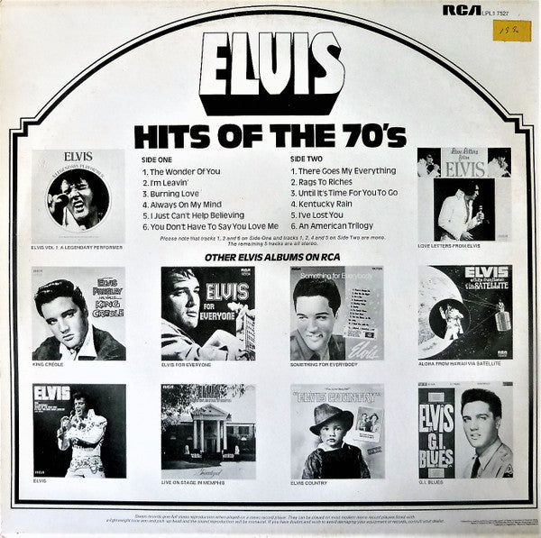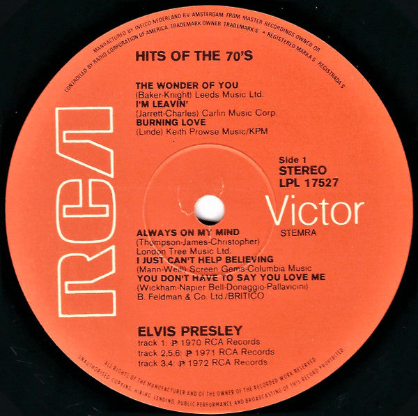 A1. The Wonder Of You A2. I'm Leavin' A3. Burning Love A4. Always On My Mind A5. I Just Can't Help Believing A6. You Don't Have To Say You Love Me B1. There Goes My Everything B2. Rags To Riches B3. Until It's Time For You To Go B4. Kentucky Rain B5. I've Lost You B6. An American Trilogy