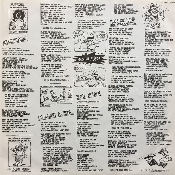 2nd Repress with text in black blurp: «Mit den 3 Top-Hits "Ba-Ba-Banküberfall" "Märchenprinz" "Heisse Nächte" Printed inner sleeve with lyrics Printed on backcover: Nino Kåre Holm "Kåre Schwedenbitter" (Die nordische Antwort auf 'Al Campari') (Erbrechen zahlt sich aus) Der Drei Goschen-Opa Klaus "Sing-Sing" Eberhartinger Vorsicht!! Macht von seiner Stimme Gebrauch! "Der Greifer" Thomas Spritzer (Wegen wiederholter Saitenmisshandlung zu lebenslänglichem Gitarre- üben verurteilt) "Der Würger Von Basston" Eik Breit (Bass) Inspektor Korrupnik Der Trommelmeuchler aus Malmö "Das Superhirn" Mecky Esser Der Speisekammer-Räuber + Mario "Palermo" Bottazzi (Derzeit untergetaucht) Die Täter: Verbrochen und produziert wurde diese kriminelle Platte von [... (Am elektrischen Studio-Stuhl) Tatort: Sound-Kill-Studio (Alias: Sound-Millstudio-Vienna) Motiv: Triebhafte, infantile Veranlagung aller Beteiligten Alibi: Keines Was weiters geschah: Kräftig aufgemischt wurde das Korpus-Delikti in der Sound-Verbesserungs-Anstalt Henkers-Mahlzeiten + Resozialisierungsversuche: (Engel)-Ingrid EAV-Spezialdank: Christian (Der Ehrenwerte) Jo Artner, der Ruchlose Mitwisser und Öffner der Schatulle. Strafausmass für LP-Käufer: Lebenslängliche Freude! ℗ 1985 A Thorn EMI plc trade mark ⊚ 12C 066-1333631 [•̲ ̲•̲ 12C 266-1333634 Labels: ℗ 1985 EMI Columbia Austria Ges.m.b.H. Made in EEC