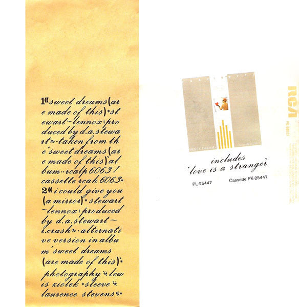 ℗ 1983 RCA Ltd. Sleeve © 1982 RCA Ltd Record Division Manufactured by RCA BV Holland from master recordings of RCA Records. Taken from the "Sweet Dreams (Are Made Of This)" album. B Side is an alternative version to the one on the album Sweet Dreams (Are Made Of This).
