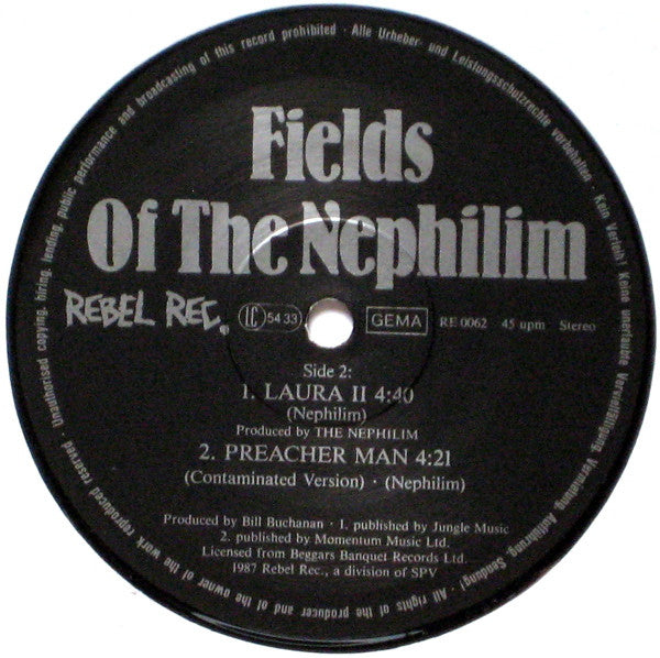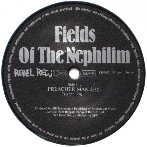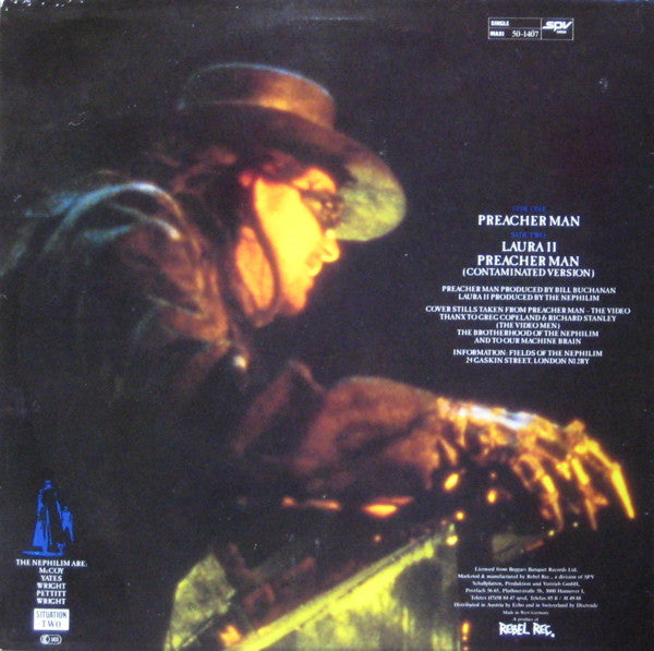 Cover stills taken from 'Preacher Man - The Video' A & B2: Published by Momentum Music. B1: Published by Jungle Music Licensed from Beggars Banquet Records Ltd. Manufactured and marketed by Rebel, Rec., a division of SPV Schallplatten, Produktion und Vertrieb GmbH. Distributed in Austria by Echo and in Switzerland by Disctrade. Made in West-Germany. very similar to [r16022737 but this release has black labels with silver letters