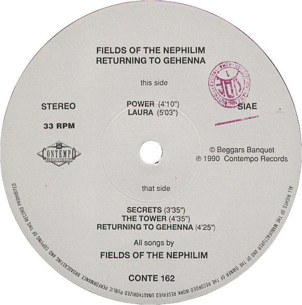 Originally released in 1986: Returning To Gehenna. Reissue also available on clear vinyl. Track A2 is also known as "Laura II". © Beggars Banquet ℗ 1990 Contempo Records Licensed from Jungle Records. Manufactured and distributed by Contempo Records.
