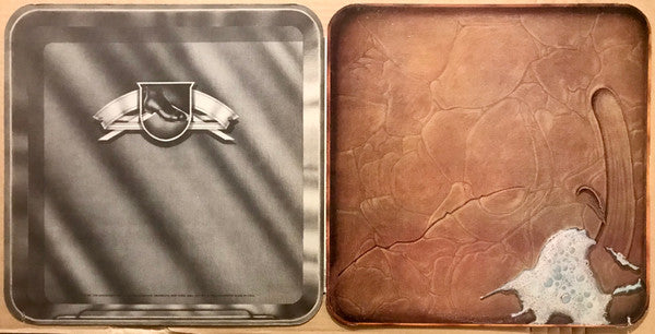 Gatefold cover has rounded corners to mimic a can of shoe polish.