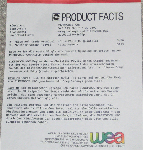 Made in Germany by WEA Musik GmbH ℗ & © 1990 Warner Bros. Records, Inc. for the US and WEA International Inc. for the world outside of the US. B-Side recorded live December 12, 1987, at the Cow Palace, San Francisco, CA. From the Album 38633 926 111-1 (WX335); 7599-26111-1 / 4 / 2 8605 copies pressed.