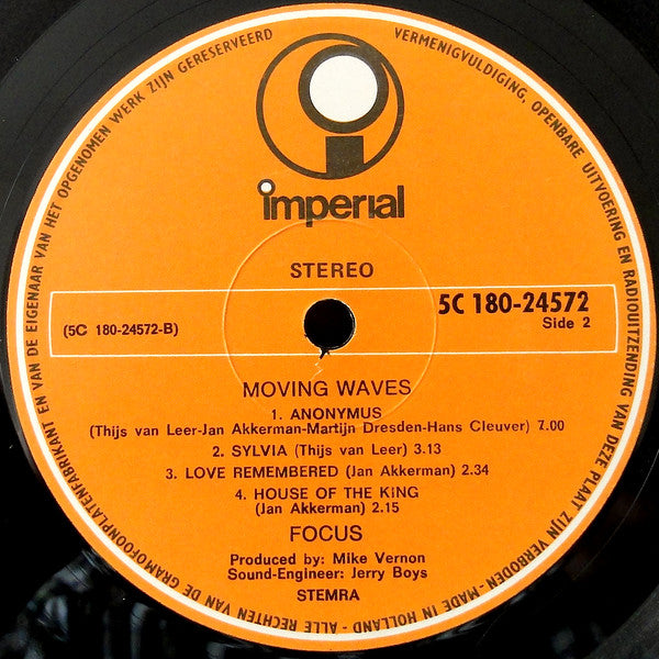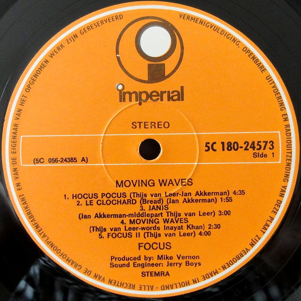 Gatefold cover This is a compilation of the first two Focus albums, "In And Out Of Focus" & "Focus II" (Released abroad as "Moving Waves"). Please note however that tracks were replaced for side 2: "Black Beauty" and "Focus (vocals)" of "In And Out Of Focus" were replaced by "Tommy", "Sylvia", "Love Remembered" and "House Of King". Labels here have a white circle around rim text, which others have not! Recorded in the Sound Techniques and Morgan Studios London. World copyright all titles-Radio-Tele-Music-Brussels Manufactured by B.V. Bovema/EMI, Haarlem, Holland. Een Habo hoes Actual cat# is 5C 180-24 572/73 Record 1 has cat# 5C 180-24 572 Record 2 has cat# 5C 180-24 573 Back cover and label read 4:35 as duration of C1 Hocus Pocus, but it is actually 6:35.