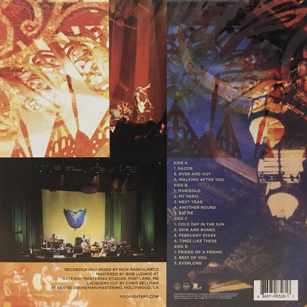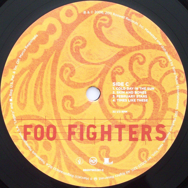 A sticker affixed to the shrink wrap on the front of the record reads: "Skin And Bones first ever live Foo Fighters album featuring unique live interpretations of fan favorites including: 'Everlong,''My Hero' and 'Best Of You'. Includes Free High Quality MP3 album download 88697983281S1.