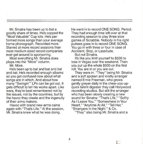 On the back of the booklet there's the text: "My, my, THAT'S LIFE - An Assemblage of songs which say much, and to many by FRANK SINATRA.