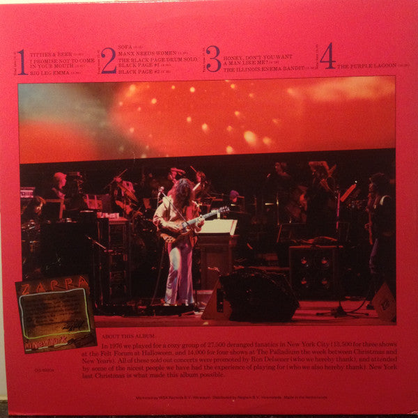 "About this album: In 1976 we played for a cozy group of 27,500 deranged fanatics in New York City (13,500 for three shows at the Felt Forum at Halloween, and 14,000 for four shows at the Palladium the week between Christmas and New Year's). All of these sold out concerts were promoted by Ron Delsener (who we hereby thank), and attended by some of the nicest people we have had the experience of playing for (who we also hereby thank). New York last Christmas is what made this album possible."