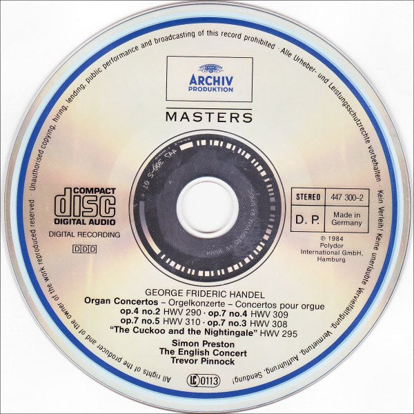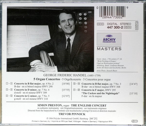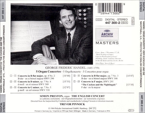 . Concerto In B Flat Major, Op. 4 No. 2 (HWV 290) 10:00. Concerto In D Minor, Op. 7 No. 4 (HWV 309) 15:55. Concerto In G Minor, Op. 7 No. 5 (HWV 310) 12:07. Concerto In B Flat Major, Op. 7 No. 3 (HWV 308) 14:47. Concerto In F Major, Without Op. No. (HWV 295) "The Cuckoo And The Nightingale" 13:10