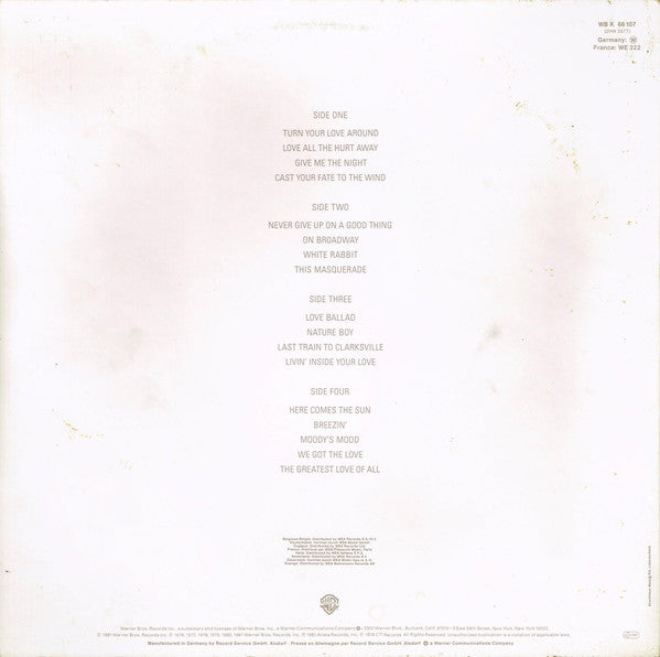 A1. Turn Your Love Around 3:49 A2. Love All The Hurt Away (Duet With Aretha Franklin) 4:08 A3. Give Me The Night 3:42 A4. Cast Your Fate To The Wind 6:58 B1. Never Give Up On A Good Thing 4:04 B2. On Broadway 5:14 B3. White Rabbit 6:57 B4. This Masquerade 3:17 C1. Love Ballad 4:15 C2. Nature Boy 4:17 C3. Last Train To Clarksville 5:00 C4. Livin' Inside Your Love 6:38 D1. Here Comes The Sun 2:32 D2. Breezin' 5:39 D3. Moody's Mood 3:25 D4. We Got The Love (Duet With Chaka Khan) 3:26 D5. The Greatest Love Of All 5:33