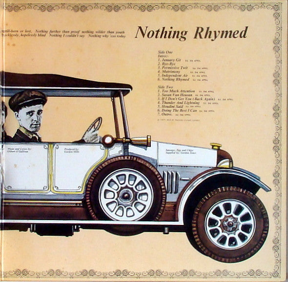 Inside the gatefold sleeve at top from left side to right side is a 'car', inside of which are black and white head photos of celebrities with Credits along the side. At the top, to the left is 'Gilbert O'Sullivan' then, "Nothing old nothing new nothing ventured Nothing gained, nothing still-born or lost, Nothing further than proof nothing wilder than youth