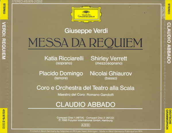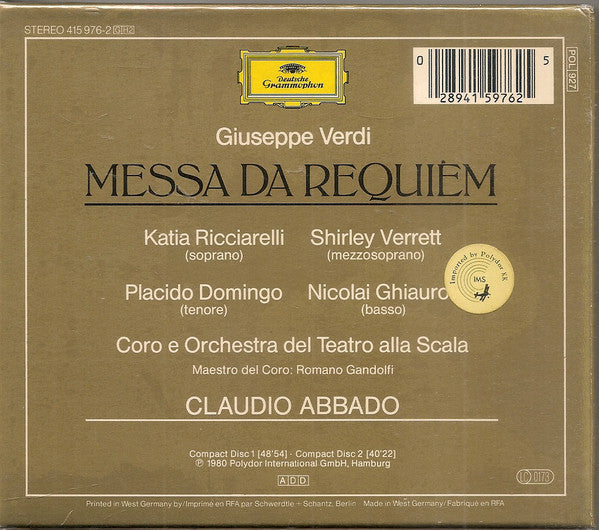 Giuseppe Verdi, Claudio Abbado, Katia Ricciarelli, Shirley Verrett, Placido Domingo, Nicolai Ghiaurov, Coro Del Teatro Alla Scala E Orchestra Del Teatro Alla Scala, Romano Gandolfi - Requiem (2xCD, Album)