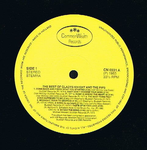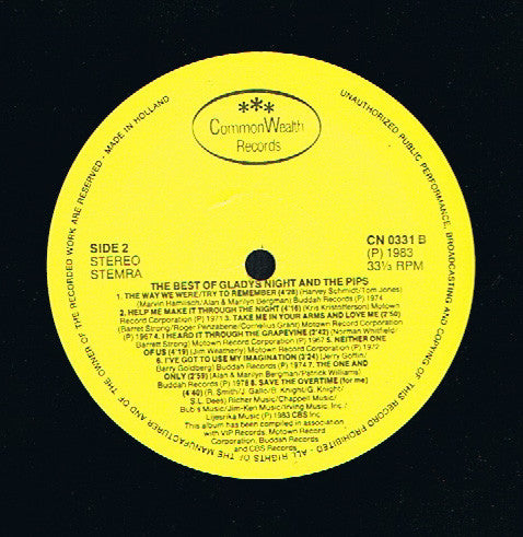 This Album has been compiled in association with VIP Records, Motown Record Corporation, Buddah Records and CBS Records A1 ℗ 1978 Buddah Records A2 ℗ 1977 Buddah Records A3 ℗ 1977 Buddah Records A4 ℗ 1973 Buddah Records A5 ℗ 1973 Buddah Records A6 ℗ 19748 Buddah Records ? A7 ℗ 1980 Nick-O-Val Music Co., Inc. / CBS Inc. A8 ℗ 1974 Buddah Records B1 ℗ 1974 Buddah Records B2 ℗ 1971 Motown Record Corporation B3 ℗ 1967 Motown Record Corporation B4 ℗ 1967 Motown Record Corporation B5 ℗ 1972 Motown Record Corporation B6 ℗ 1974 Buddah Records B7 ℗ 1978 Buddah Records B8 ℗ 1983 Richter Music / Chappell Music / Bub's Music / Jim-Ken Music / Irving Music, Inc. / Lijesrika Music / CBS Inc. sleeve-info: TV LP ℗ © 1983 Common Wealth Records - Distribution Belgium: Carrere Brussels label-info: ℗ 1983 Made in Holland