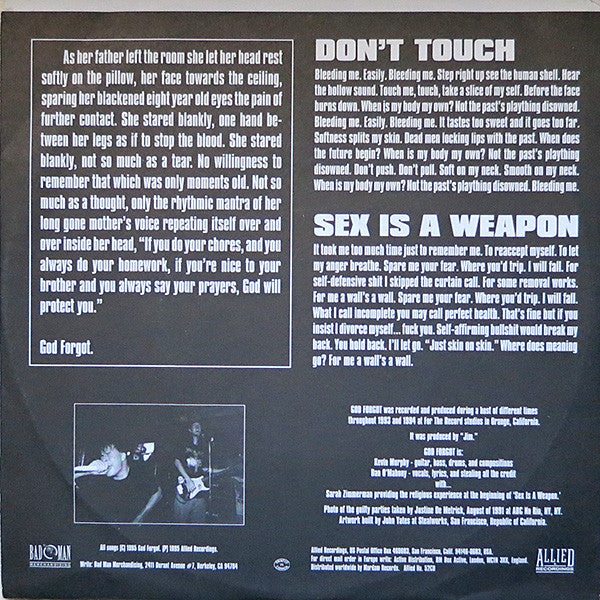 God Forgot was recorded and produced during a host of different times throughout 1993 and 1994 at For The Record Studios in Orange, California.