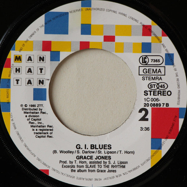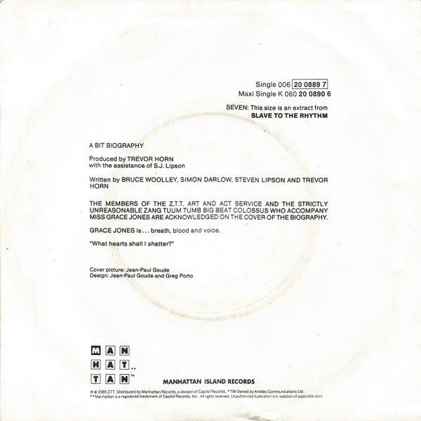 Labels: ℗ © 1985 ZTT. Distributed by Manhattan Rec., a division of Capitol Rec., Inc. Excerpts from 56303 the album from Grace Jones Made In EEC. Back cover: Seven: This size is an extract from 56303 A bit biography The members of the Z.T.T. Art and Act Service and the strictly unreasonable Zang Tuum Tumb Big Beat Colossus who accompany Miss Grace Jones are acknowledged on the cover of the biography. Grace Jones is... breath, blood and voice. "What hearts shall I shatter?" ℗ © 1985 ZTT. Distributed by Manhattan Records, a division of Capitol Records. *TM Owned by Antilles Communications Ltd.