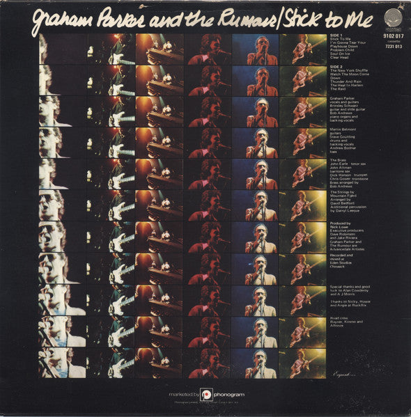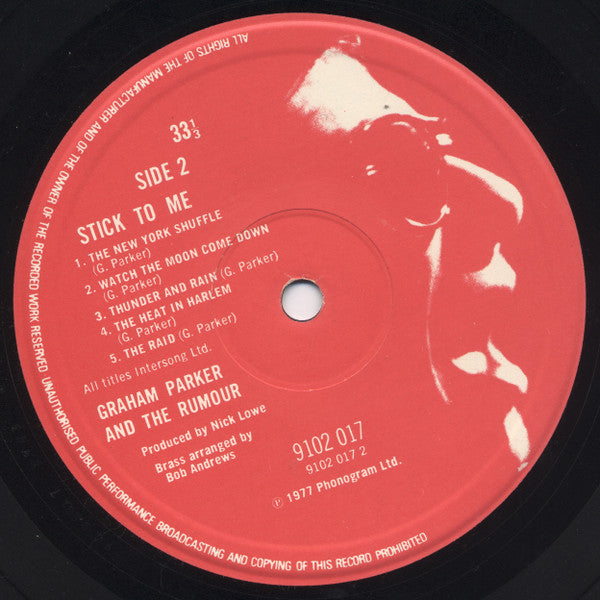 On spine as "Graham Parker & The Rumour" Had an insert strip of coloured stickers and a clear outer cover printed with large scripted "GP" "An Exquisite cover" All titles Intersong Ltd. exc. A2 Burlington Music Ltd. A2 is miscredited on label to A. Peebles. The correct writer of A2 is [a601973. [a80089 seems to be the first to record the song (in 1972). See [m408355