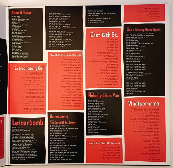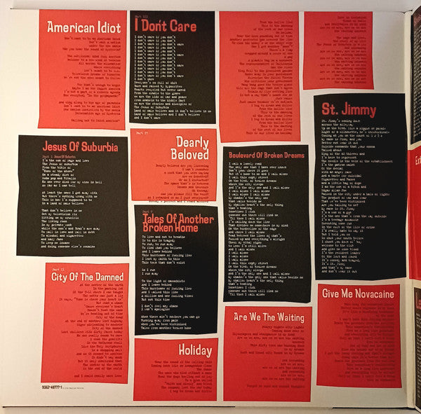 Double gatefold sleeve. Tracks listed sequentially. Features lyrics in the inner artwork.