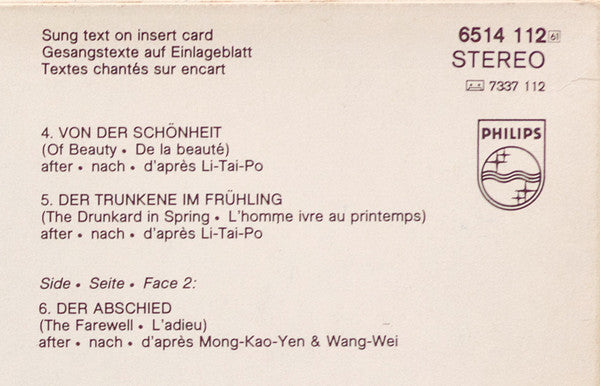 Adapted from a published volume of poetry, a collection of paraphrases from Chinese lyrics called "Die Chinesische Flote(The Chinese Flute)" by Hans Bethge.