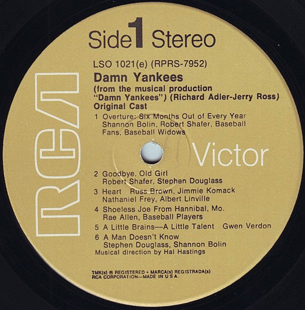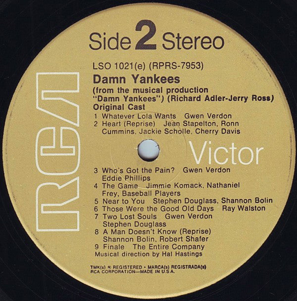 Complete title as it appears on front of sleeve: Frederick Brisson, Robert E. Griffith and Harold S. Prince (in association with Albert B. Taylor) present Gwen Verdon in "Damn Yankees" Stereo effect reprocessed from monophonic Dynaflex © 1955, RCA Records, New York, N.Y. Printed in U.S.A. Made in U.S.A. This is a later beige label version.