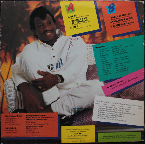 On the B side label, order appears as follows: 1. Caribbean Spirit, 2. Satan In Control, 3. Gimme Some