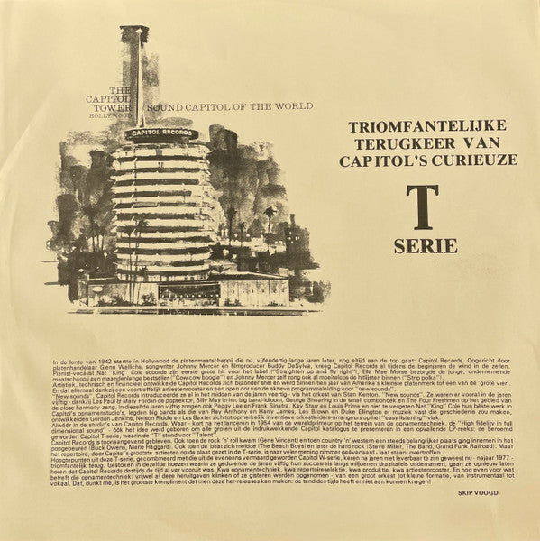 The year 1977 is obtained from the liner notes on the inner sleeve, which read: "Hoogtepunten uit deze t-serie, gecombineerd met die uit de eveneens vermaard gewrorden Capitol W-serie, keren na jaren niet leverbaar te zijn geweest nu - najaar 1977 - triomfantelijk terug." This as far as I can roughly translate, means that this album has not been available for years, until now - autumn 1977.