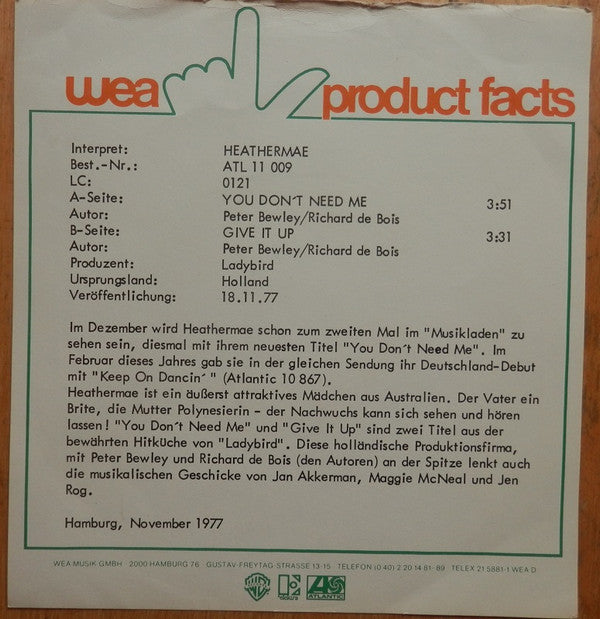 Heathermae - You Don't Need Me (7", Single)