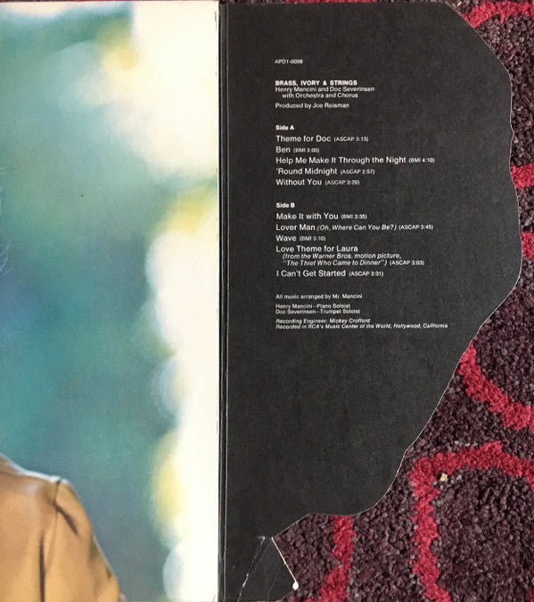 Henry Mancini and Doc Severinsen with Orchestra and Chorus B4 from the Warner Bros. motion picture "The Thief Who Came to Dinner" Recorded at RCA's Music Center of the World, Hollywood, California © 1973, RCA Records, New York, N.Y. • Printed in U.S.A. RCA Corporation—Made in U.S.A. ℗ 1973 RCA Records Cover has a die-cut flap of Doc Severinsen that folds open to remove the record
