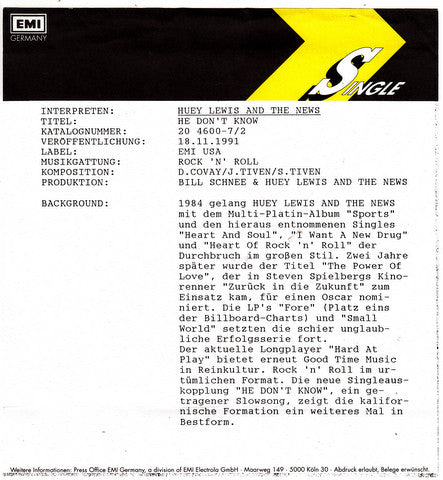 Huey Lewis And The News* - He Don't Know (7", Single)
