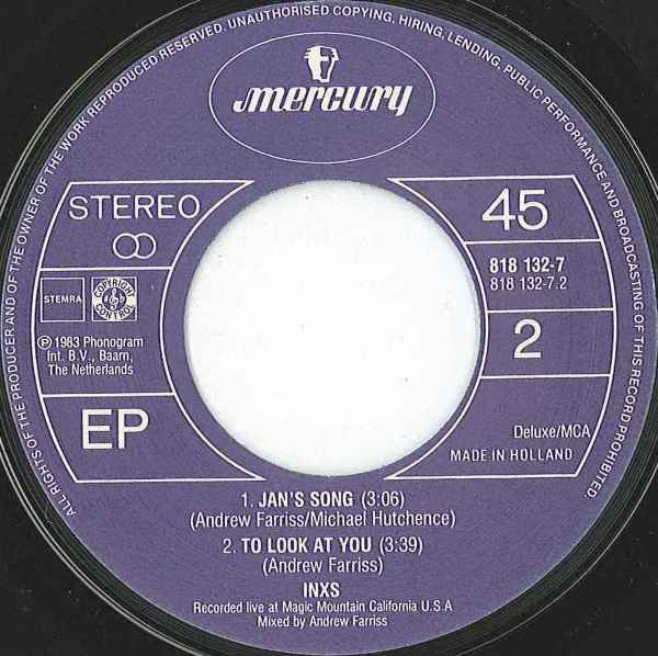 Ⓟ 1983 © INXS Ⓟ 1983 Phonogram International B.V., Baarn, The Netherlands Made in Holland Deluxe/MCA B-Side: Recorded Live At Magic Mountain California U.S.A. Lyrics Printed Permission Of Deluxe Music Title On Sleeve: Original Sin Title On Label: The Original Sin