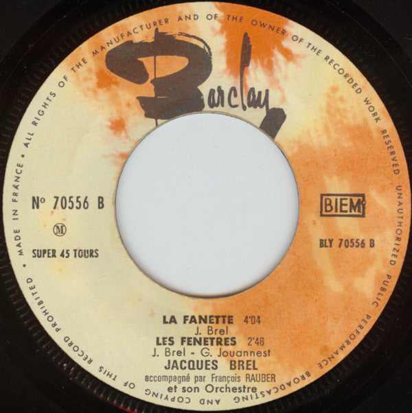 The cover of this version is different. Front cover have words in black printed on other colors. And back cover have a tracklist in paper stuck on old tracklist: Les Toros, J'Aimais, La Fanette (Written By - J. Brel - G. Jouannest - F. Rauber), Les Vieux.